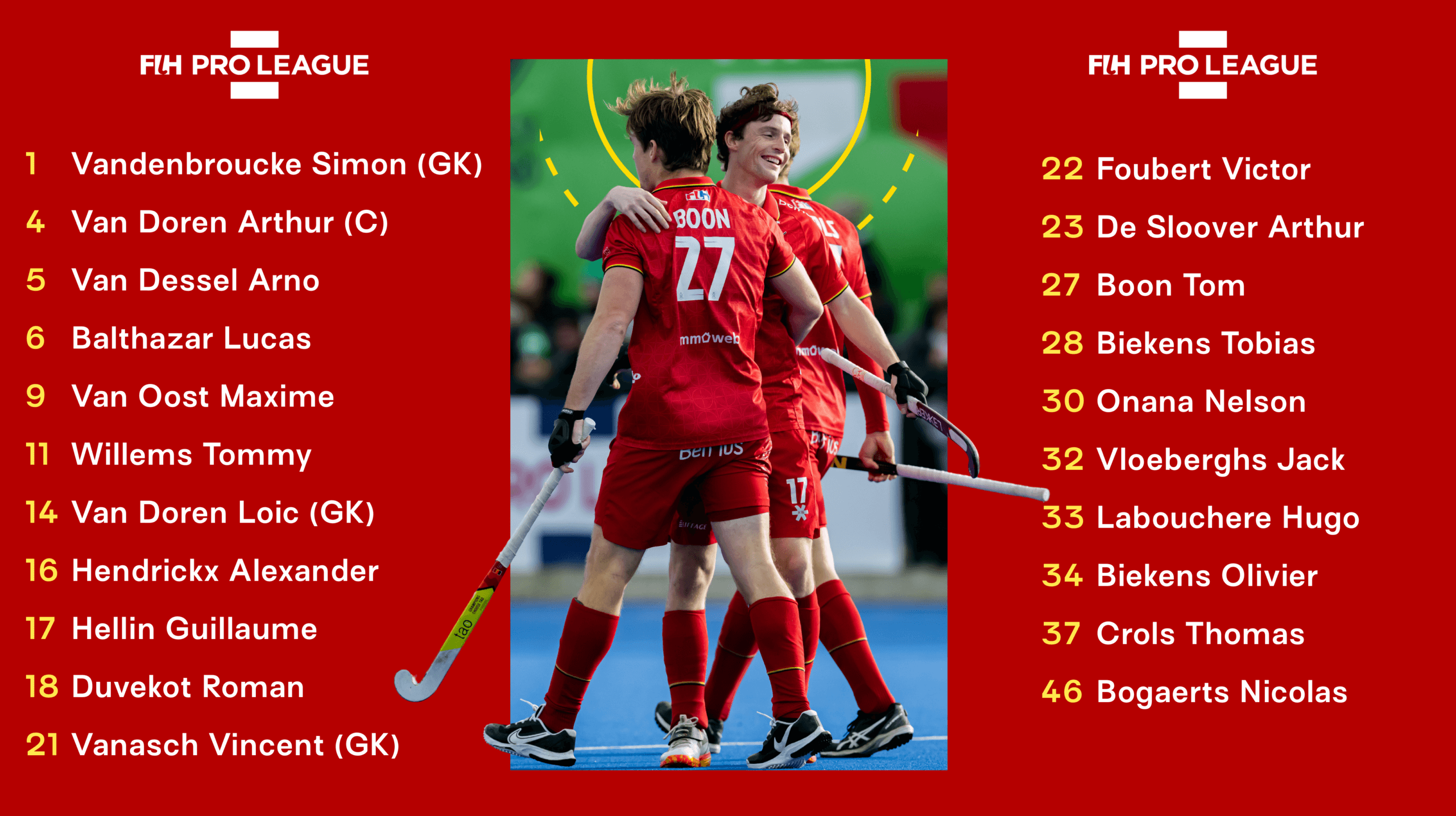 De groep die in Rourkela blijft, zal volledig beschikbaar zijn voor de Pro League-wedstrijden. Arthur Van Doren draagt de aanvoerdersband, met Arthur De Sloover als vice-aanvoerder.